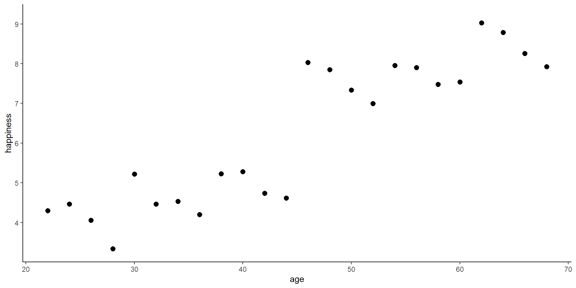 Assume we want to know the relationship between age (as our independent variable) and happiness (as our dependent variable), and we have data on 24 observations.