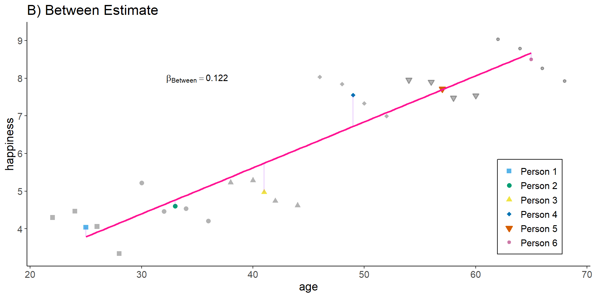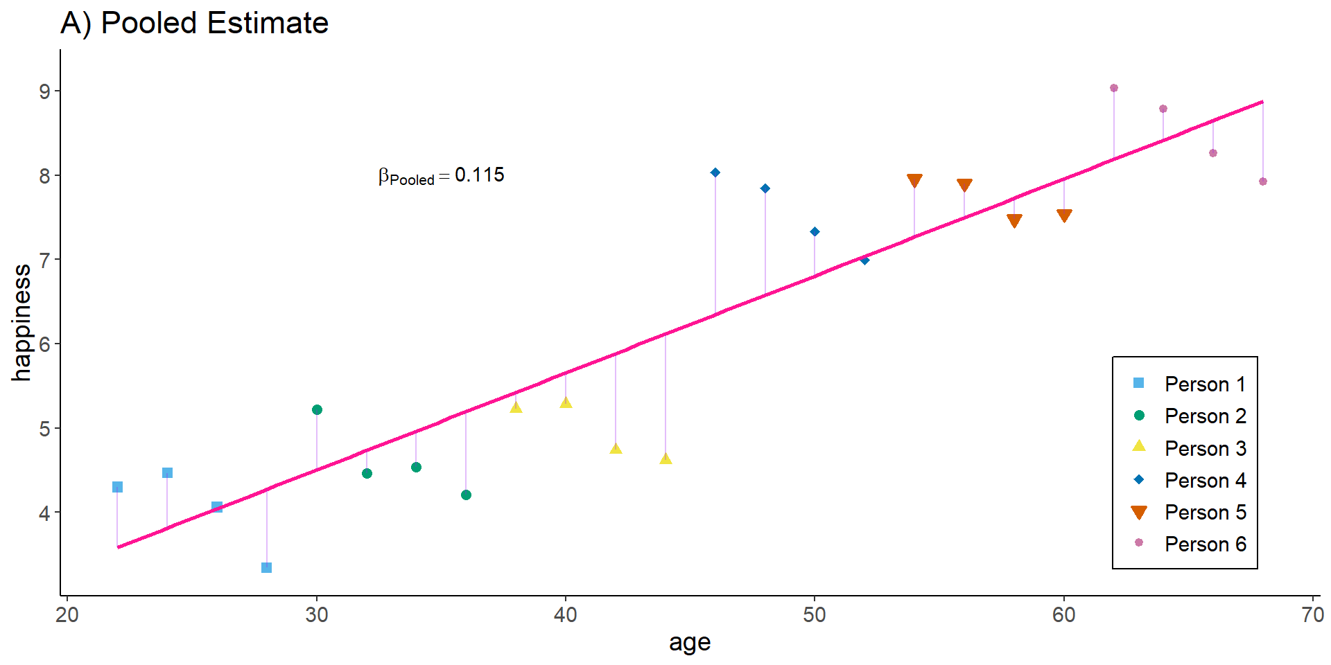 # Save the residual valuesdf$predicted <-predict(lm1)df$residuals <-residuals(lm1)zp3 <-ggplot(df, aes(age, happiness)) +geom_point( aes(x = age, y = happiness, shape = idname, colour = idname, fill = idname), size =2, stroke =1) +geom_smooth(method ='lm', formula = y ~ x, se =FALSE,color ="deeppink") +geom_segment(aes(xend = age, yend = predicted), alpha = .3, color ="purple") +annotate("text", x =35, y =8.0, label =paste0("beta[Pooled] ==", round(lm1$coefficients[2], 3)), parse =TRUE) +ylim(3.3, 9.2) +expand_limits(y =c(0, 0)) +scale_colour_manual(values = cbp2[-c(1, 2)]) +scale_fill_manual(values = cbp2[-c(1, 2)]) +scale_shape_manual(values =c(15:18, 25, 20)) +ggtitle("A) Pooled Estimate") +theme_classic() +theme(legend.key =element_blank(), legend.title =element_blank(),text =element_text(size =14),legend.position =c(0.95,0.05), legend.justification =c("right", "bottom"),legend.background =element_blank(),legend.box.background =element_rect(colour ="black"))zp3