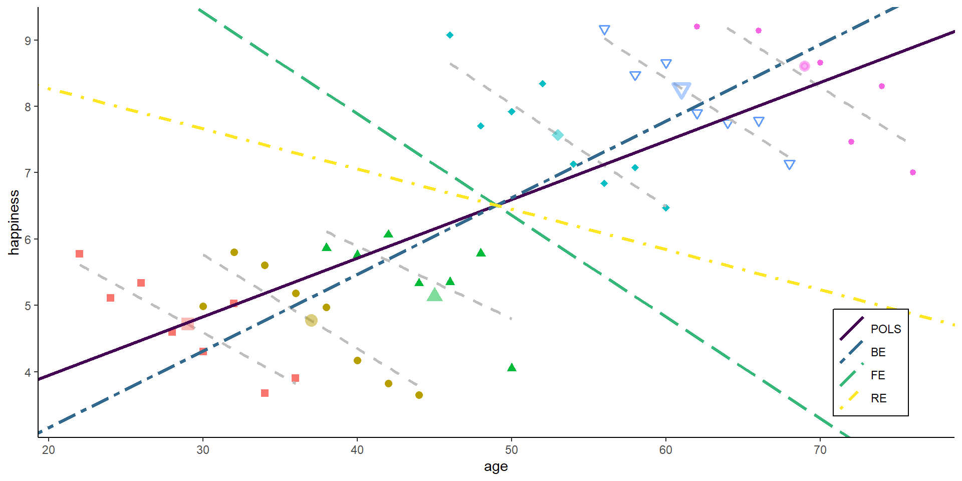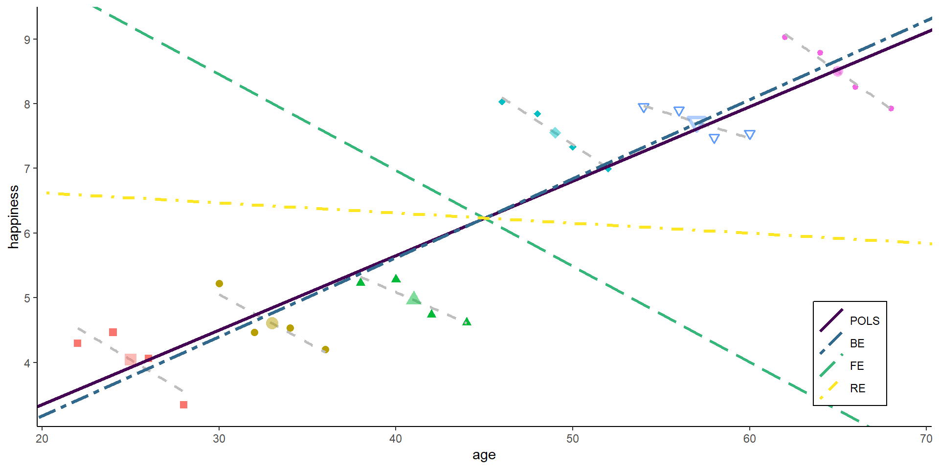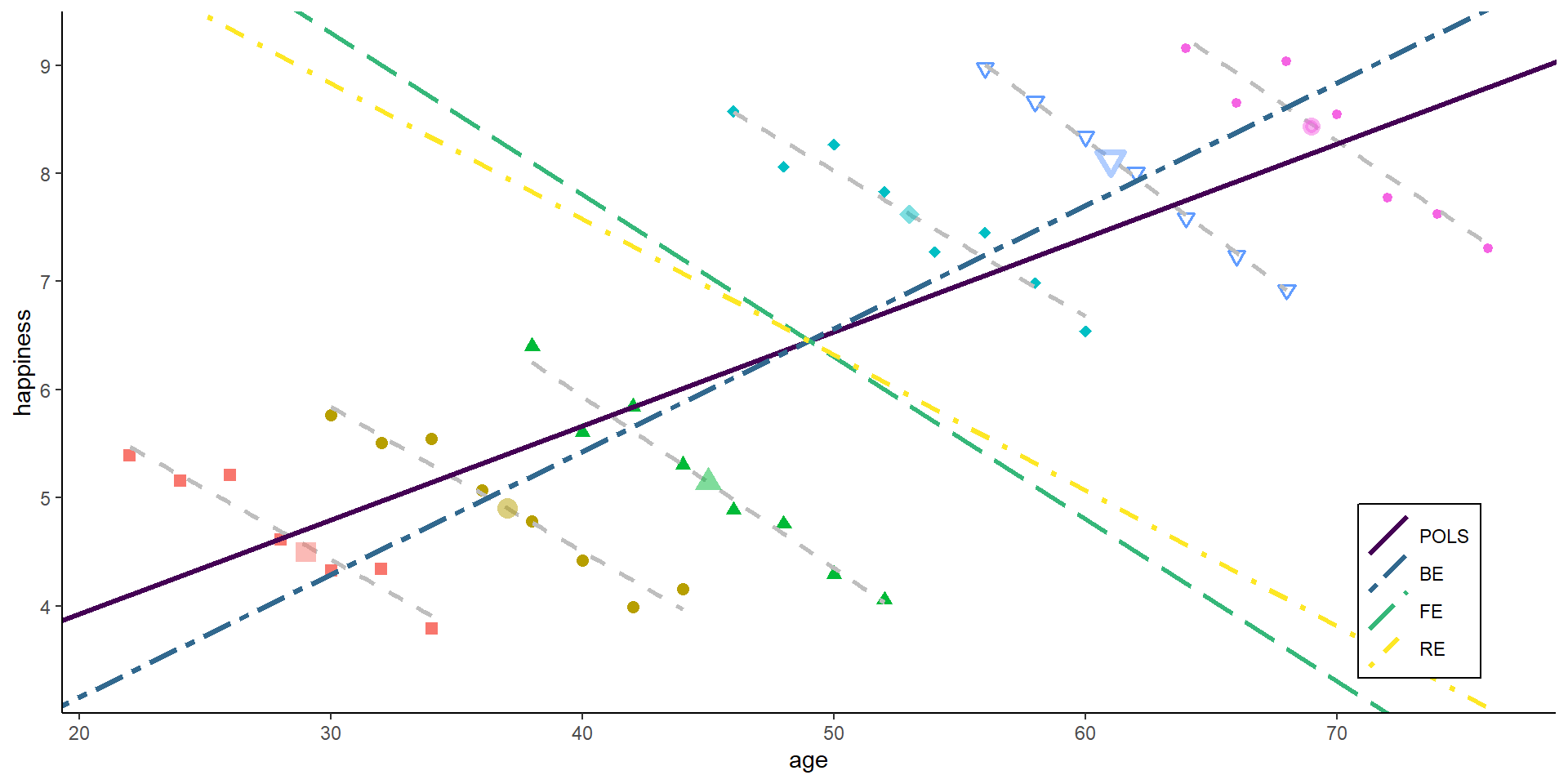 ################################### Example 1: Age happiness ###################################set.seed(213)### Data simulation programsimdata <-function(N =6, T =4,age_range =c(20:60), u_sd =0.2, uw_sd =0){# id and wave df <-data.frame(matrix(NA, ncol =2, nrow = N*T))names(df) <-c("id", "time") df$id <-rep(1:N, each = T) df$time <-rep(1:T, times = N) df$idname <-factor(df$id, levels =c(1:N), labels =paste("Person", c(1:N)))# age startingage <- age_range startingage <-round(quantile(startingage, probs =seq(0, 1, 1/(N-1))), 0) df$age <-unname(rep(startingage, each = T)) + df$time*2# cohort df$cohort <-0 df$cohort[(N*T/2+1):(N*T)] <-1 df$cohort <-factor(df$cohort, levels =c(0, 1), labels =c("Younger cohort", "Older cohort"))# demeaned age df$dm_age <- df$age -ave(df$age, df$id, FUN =function(x) mean(x)) # Personal intercept df$intercept <-5+0.5* df$id# Overall error u <-rnorm(N*T, mean =0, sd = u_sd)# Additional within error uw <-unlist(lapply(1:N, function(x) rnorm(T, mean =0, sd = uw_sd)))# Gen happiness y <-1+0.05* df$age -0.2* df$dm_age +2*as.numeric(df$cohort) + u + uw df$happiness <- y# Gen person means df$m_age <-ave(df$age, df$id, FUN =function(x) mean(x)) df$m_happiness <-ave(df$happiness, df$id, FUN =function(x) mean(x)) return(df)}### Set up six individuals with age and happinessN <-6T <-4df <-simdata(N = N, T = T)# Total line for plotlm1 <-lm(happiness ~ age, data = df)lm2 <-lm(happiness ~ age + cohort, data = df)lm3 <-lm(happiness ~ age + idname, data = df)lm4 <-lm(m_happiness ~ m_age, data = df)