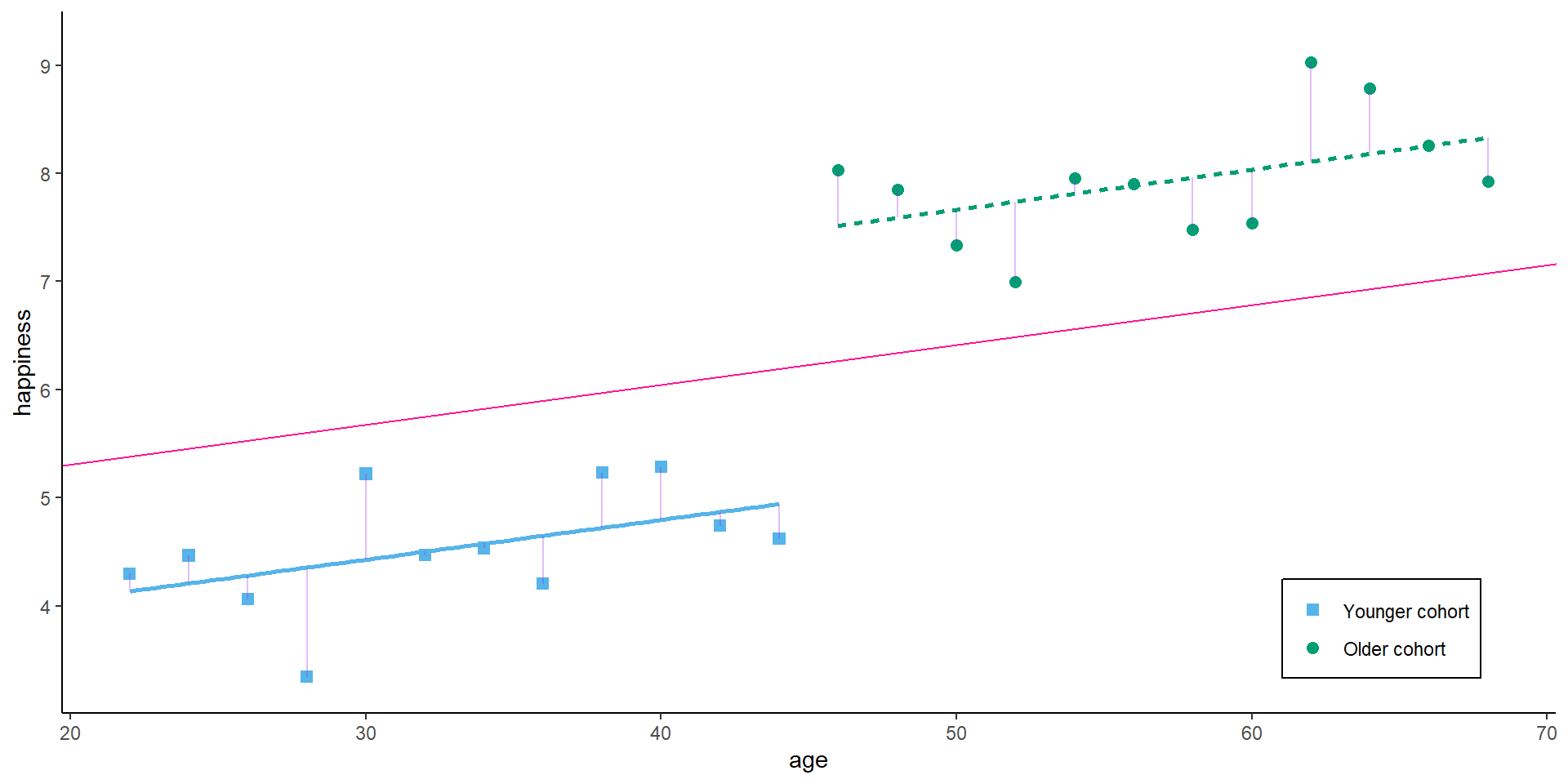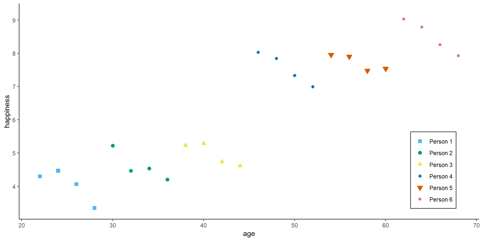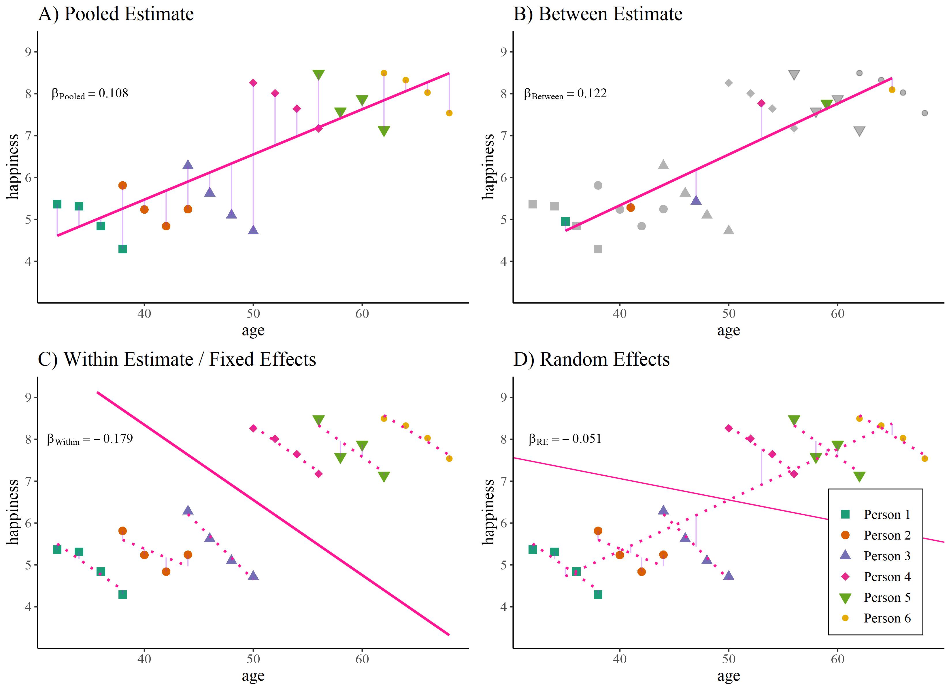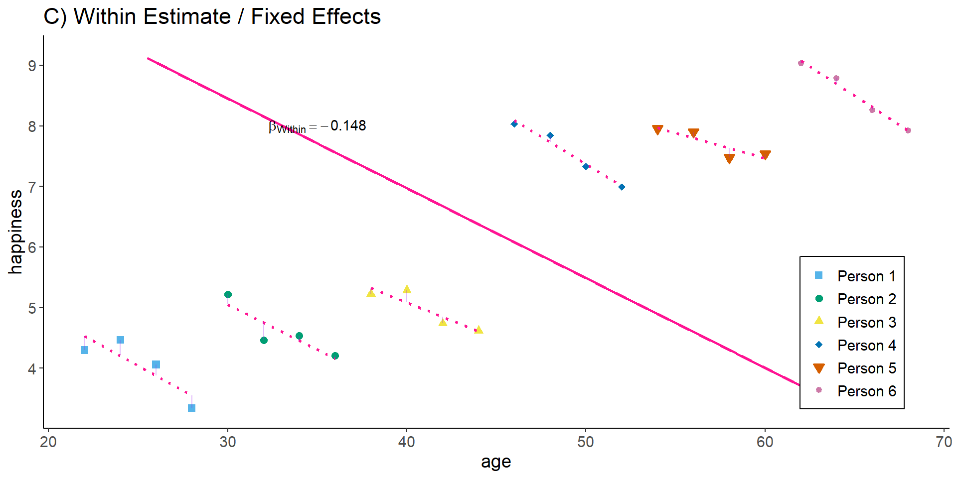 ################################### Example 1: Age happiness ###################################set.seed(213)### Data simulation programsimdata <-function(N =6, T =4,age_range =c(20:60), u_sd =0.2, uw_sd =0){# id and wave df <-data.frame(matrix(NA, ncol =2, nrow = N*T))names(df) <-c("id", "time") df$id <-rep(1:N, each = T) df$time <-rep(1:T, times = N) df$idname <-factor(df$id, levels =c(1:N), labels =paste("Person", c(1:N)))# age startingage <- age_range startingage <-round(quantile(startingage, probs =seq(0, 1, 1/(N-1))), 0) df$age <-unname(rep(startingage, each = T)) + df$time*2# cohort df$cohort <-0 df$cohort[(N*T/2+1):(N*T)] <-1 df$cohort <-factor(df$cohort, levels =c(0, 1), labels =c("Younger cohort", "Older cohort"))# demeaned age df$dm_age <- df$age -ave(df$age, df$id, FUN =function(x) mean(x)) # Personal intercept df$intercept <-5+0.5* df$id# Overall error u <-rnorm(N*T, mean =0, sd = u_sd)# Additional within error uw <-unlist(lapply(1:N, function(x) rnorm(T, mean =0, sd = uw_sd)))# Gen happiness y <-1+0.05* df$age -0.2* df$dm_age +2*as.numeric(df$cohort) + u + uw df$happiness <- y# Gen person means df$m_age <-ave(df$age, df$id, FUN =function(x) mean(x)) df$m_happiness <-ave(df$happiness, df$id, FUN =function(x) mean(x)) return(df)}### Set up six individuals with age and happinessN <-6T <-4df <-simdata(N = N, T = T)# Total line for plotlm1 <-lm(happiness ~ age, data = df)lm2 <-lm(happiness ~ age + cohort, data = df)lm3 <-lm(happiness ~ age + idname, data = df)lm4 <-lm(m_happiness ~ m_age, data = df)