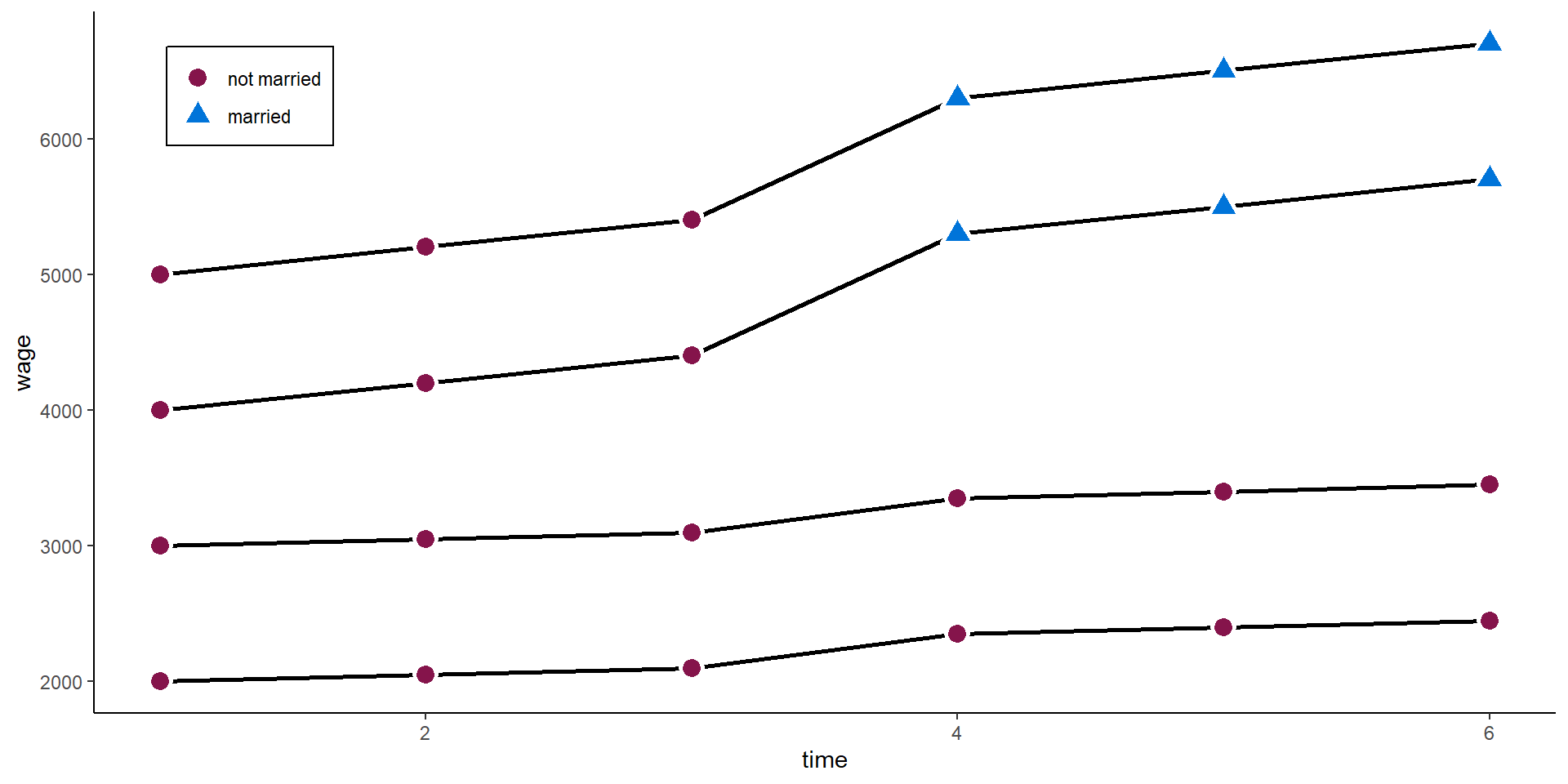 zp5 <-ggplot(df2, aes(time, wage2)) +geom_line(aes(x = time, y = wage2, group = id), lty ="solid", colour ="black", lwd =1) +geom_point( aes(x = time, y = wage2, shape = marriage, fill = marriage), size =4, stroke =1.5, color ="white") +# geom_line(aes(x = time, y = pt2, group = id, linetype = "dashed"), colour = "blue", lwd = 1) +# geom_line(aes(x = time, y = pt2_cr, group = id, linetype = "dashed"), colour = "grey", lwd = 1, show.legend = FALSE, alpha = 0.7) +scale_linetype_identity(labels ="Counterfactual", guide ="legend") +# scale_alpha_manual(values = c(0.3, 1), guide = "none") +# ylim(3.3, 9.2) + expand_limits(y = c(0, 0)) + theme_classic() +scale_shape_manual(values =c(21, 24)) +scale_fill_manual(values =c("#85144b", "#0074D9")) +scale_color_manual(values =c("#85144b", "#0074D9")) +ylab("wage") +theme(legend.key =element_blank(), legend.title =element_blank(),legend.position =c(0.05,0.95), legend.justification =c("left", "top"),legend.background =element_blank(),legend.box.background =element_rect(colour ="black"),legend.spacing.y =unit(-0.1, "cm"))zp5
