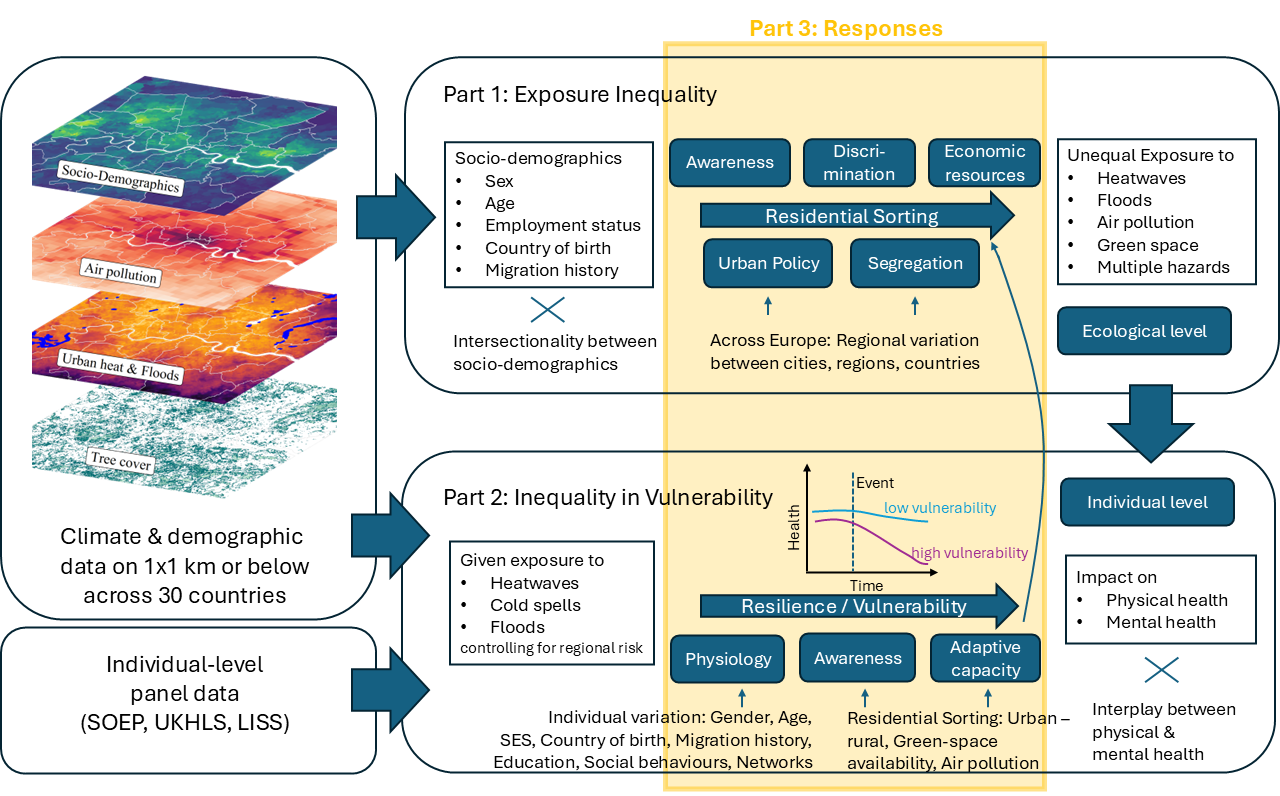 Figure 1 illustrates the theoretical structure of SOCIO-CLIMP. In the first part, SOCIO-CLIMP investigates exposure inequalities. Residential sorting and segregation processes lead certain socio-demographic groups to reside in areas with disproportionately high exposure to climate risks and environmental hazards. The extent of this unequal exposure likely varies across countries and cities and is shaped by contextual factors, such as segregation patterns and economic inequality. The second part of the project examines the unequal vulnerabilities associated with exposure to climate events. Some socio-demographic groups - due to lower adaptive capacities, limited awareness, and poorer physiological conditions - are more susceptible to adverse physical and mental health impacts. Here, individual and residential contexts (e.g., housing quality, access to green spaces) likely moderate the relationship between socio-demographic characteristics and vulnerability to extreme weather events. This vulnerability not only worsens existing inequalities in adaptive capacity but also reinforces residential sorting processes, perpetuating patterns of unequal exposure to climate risks.
